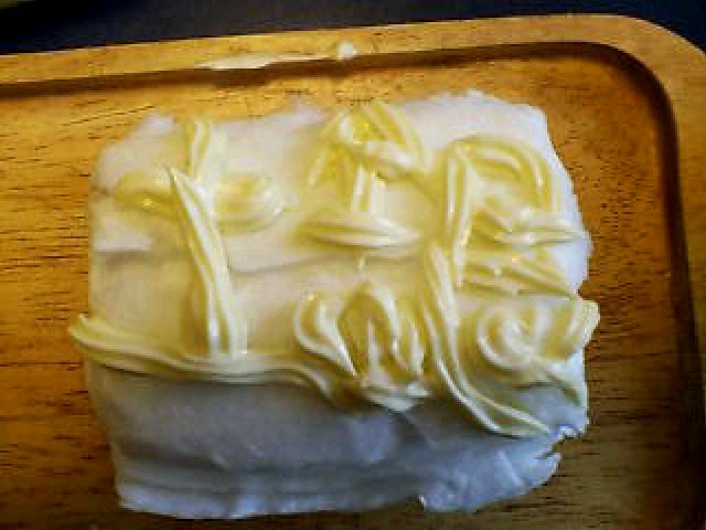 「上のクリーム少ないなこれ あー甘ぇ、美味美味♪」